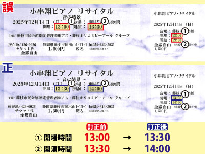 12/14(日)開催『小串翔ピアノ・リサイタル-音の情景(ファンタジー)-』チケットの表記について、下記の内容に誤りがございましたので、訂正し、お詫びを申し上げます。 ×訂正前: 開場時間13:00/開演時間13:30 〇訂正後 開場時間13:30/開演時間14:00 既にチケットをご購入されたお客様には、大変申し訳ございませんでした。チケット交換の必要はございませんので、公演当日はそのままご購入いただいたチケットを持ってお越し下さい。